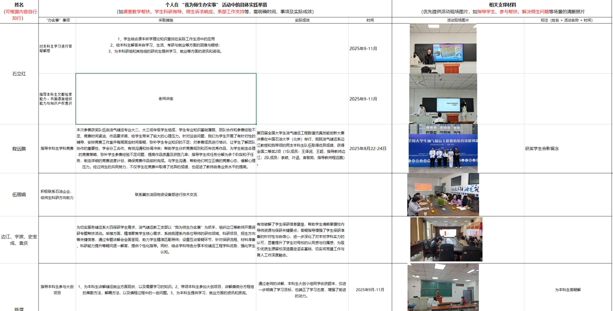 (通讯员 边江 伍丽娟)自2024年8月启动以来,油气储运工程系教工党支部“我为师生办实事”实践活动已扎实推进一年有余。支部始终坚持党建引领,以师生急难愁盼问题为导向,累计开展各类服务活动32场,覆盖师生800余人次,将党建成果切实转化为育人实效。通过一系列精准化、常态化服务举措,在学生成长成才、教师能力提升、教学科研发展等方面取得显著成效,书写了服务育人的生动答卷。