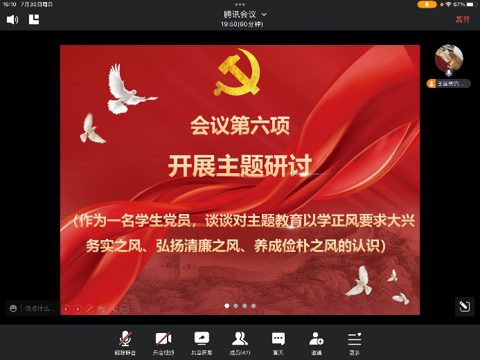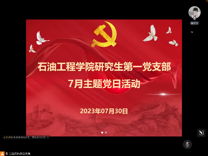 (通讯员 田嘉鑫)2023年07月30日下午3时许,球王会体育官方网研究生第一党支部于腾讯会议召开七月主题党日活动。本次会议由王国庆同志主持,支部书记史永波及支部党员参会。