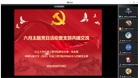 (通讯员 盛钲钦)2023年06月29日晚七时,球王会体育官方网研究生第一党支部与中国石油大学(北京)井筒安全与控制党支部于腾讯会议召开六月主题党日活动暨支部共建交流。本次会议由王国庆同志主持,研究生第一党支部书记史永波老师、支部党员及井筒安全与控制党支部党员参会。