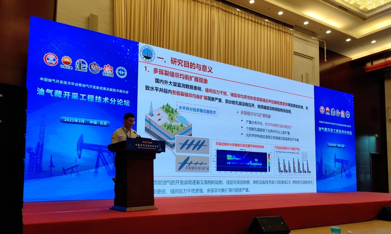 许文俊博士作了题为“页岩油气均衡压裂基础理论与优化技术”的大会报告。报告以页岩油气体积压裂改造过程中多簇水力裂缝非均衡扩展现象严重的工程难题为切入点,重点阐述了多簇水力裂缝动态演化规律,提出了利用“射孔限流法”和“暂堵转向法”促进多簇水力裂缝均衡扩展的技术思路,并结合现场实例详细阐明了这两类工艺技术的适用条件与优化方法,为我国页岩油气开发主战场逐渐由海相向陆相、浅层向深层转移、体积压裂技术由1.0发展到2.0,提供了理论支持和技术指导。