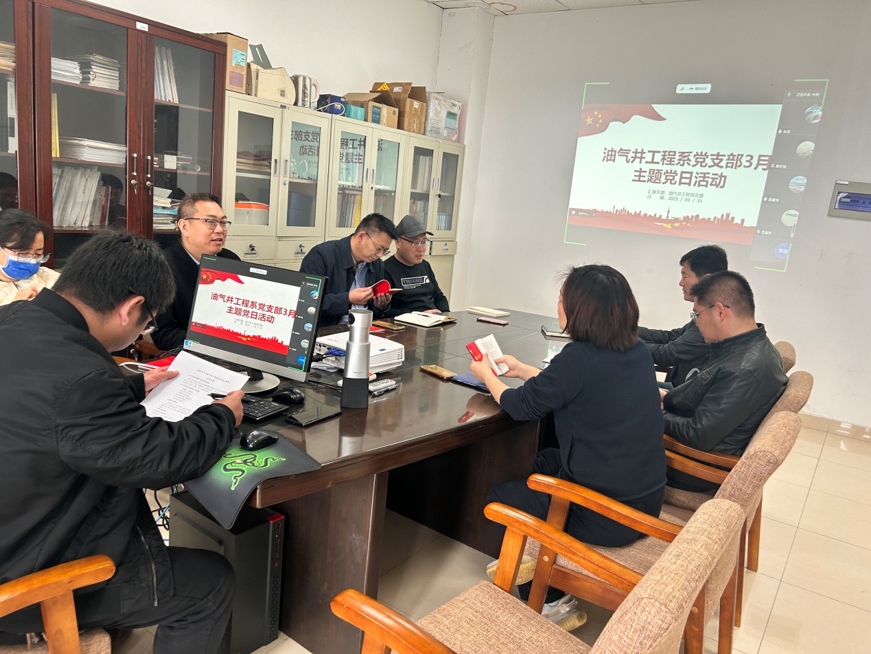 (通讯员 余义兵)3月23日,油气井工程系教工党支部以线下和线上相结合的形式开展了3月支部主题党日活动,由支部书记高斐同志主持。本次活动的主题是深入学习贯彻习近平总书记重要讲话精神,学习领会全国两会精神,进一步统一思想、凝聚共识,谋求新发展、实现新突破,始终保持昂扬向上的奋斗姿态,奋力书写学校高水平大学建设新篇章。