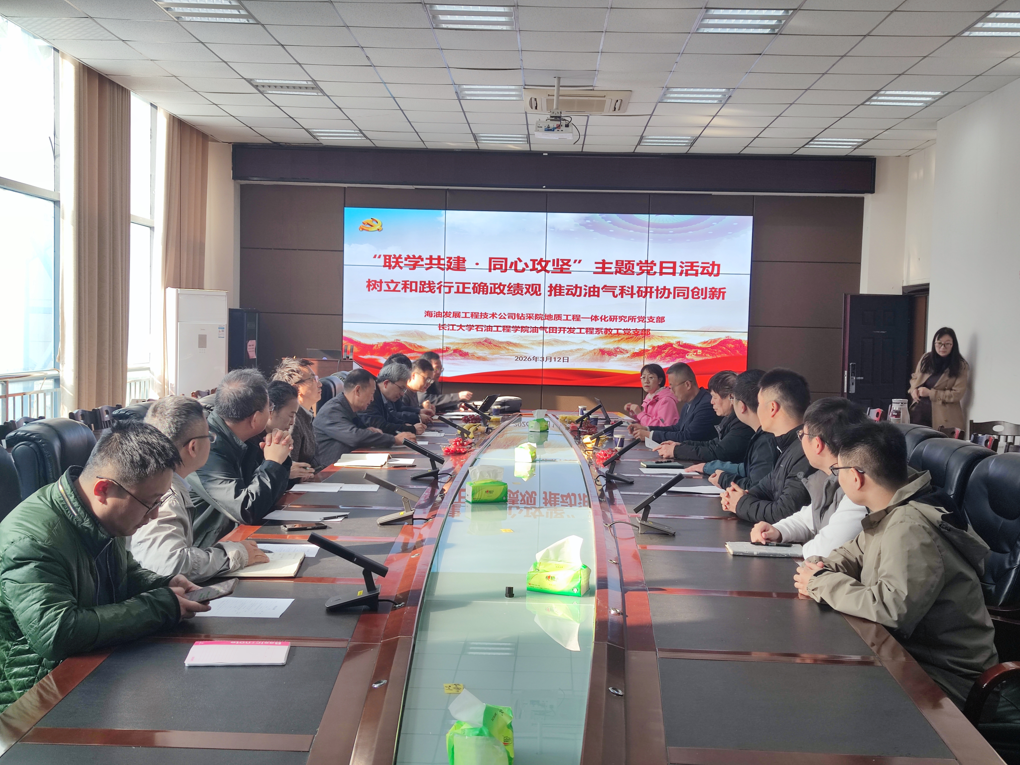 (通讯员 蔡琼 许文俊)为深入学习贯彻党的二十届三中全会精神,扎实推动党建与业务深度融合,3月12日,球王会体育官方网球王会体育官方网油气田开发工程系教工党支部与中海油能源发展工程技术公司钻采院地质工程一体化研究所党支部在石油科技大楼B113会议室联合开展“联学共建·同心攻坚”主题党日活动。中海油能源发展工程技术公司钻采院地质工程一体化研究所党支部书记石雪峰主持活动,油气田开发工程系教工党支部师生代表及钻采院地质工程一体化研究所专家代表参加活动。