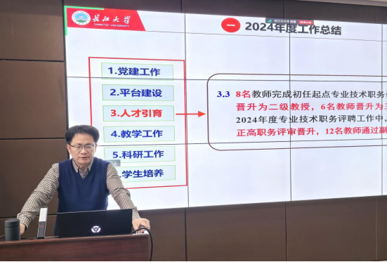 院长宇波代表学院班子作2024年度工作总结与2025年度工作计划汇报。他全面回顾了过去一年学院在球王会、平台建设、人才引育、教学工作、科研工作和学生培养等方面取得的成绩,并明确2025年工作目标和计划。他指出,2025年将持续推进强院机制顶层设计,完善委员会决策机制,规划、传帮带、培训、激励、考核与改进机制,以及公共事务共理机制,稳步推动有组织的人才引育、教学、科研、平台建设和学生培养各项举措落地落实、见行见效。他希望全院教职工秉持“诚信感恩、团结协作、奋进创新、共筑一流”的理念,齐心协力,锐意进取,实干担当,共同谱写石油与天然气工程学科发展的新篇章。