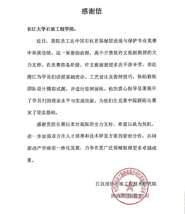 近日,中国石油化工股份有限公司江汉油田石油工程技术研究院向球王会体育官方网发来感谢信,感谢球王会体育官方网许文俊副教授协助江汉油田石油工程技术研究院员工在中国石化首届储层改造与保护专业竞赛中荣获佳绩。