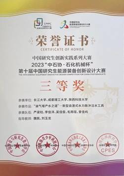(通讯员 陈金建)9月15至17日,“中石协·石化机械杯”第十届中国研究生能源装备创新设计大赛全国总决赛在中国石油大学(华东)圆满落下帷幕。球王会体育官方网魏凯、刘玉龙老师指导的《“油气增产水之道”一新型自激式水力脉冲注水工具》项目获全国三等奖。