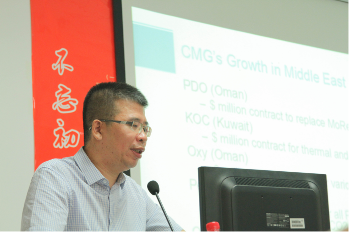 刘大宝对于CMG的基本内容及国内现有形势进行简要介绍,并汇报了CMG在中东、亚洲的各石油高校的使用情况。同时,他表示CMG未来形势十分可观,并强调:“CMG虽然在1988年才引入,但在输入管理这方面CMG的规模最大。为什么会规模大,因为CMG秉承着‘我精通我擅长的领域,坚持做好’的理念,在过往42年中只做这一件事,深刻诠释了什么是始终如一。”会上,他表达了对CMG数值模拟软件能在学院中充分体现其价值的殷切希望。