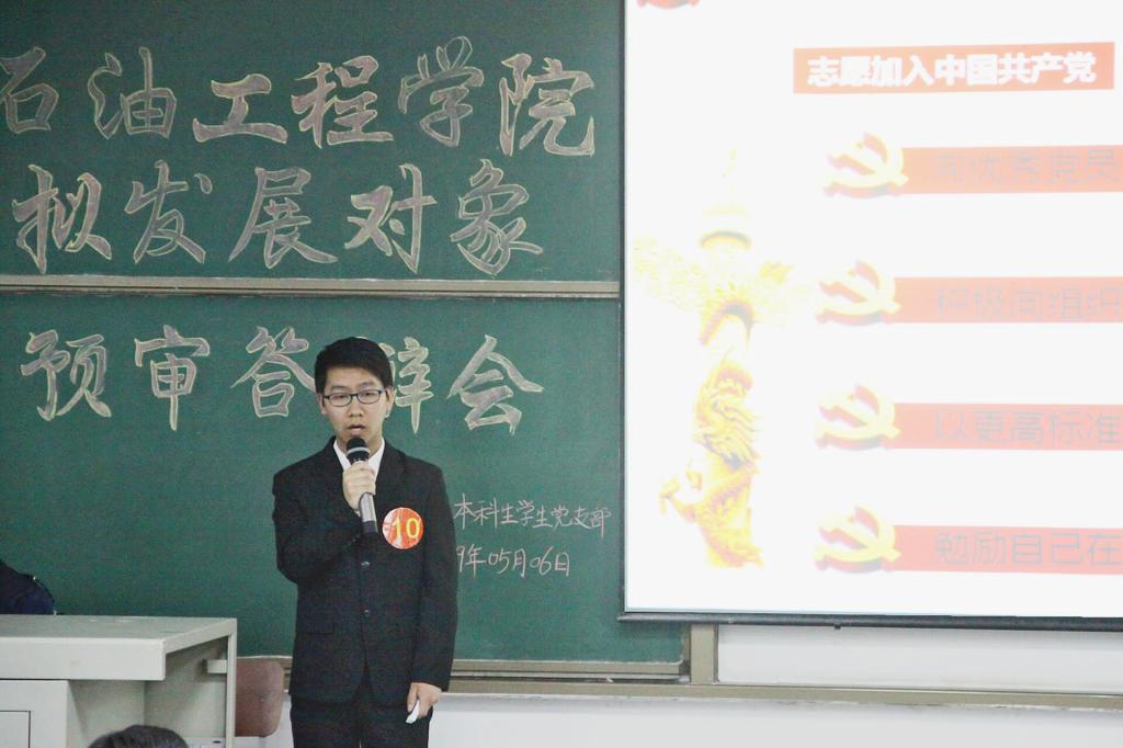每一位答辩选手都是油工院最出色的学子,他们不仅仅是学习中的佼佼者,成绩名列专业前茅,更是球王会体育官方网各个社团组织以及各类活动的引领者,带领同学们积极进取,奉献自己。在答辩的自我陈述部分,大家结合自身实际情况,具体深入地谈到了对党的认识、入党动机和自身的现实表现。在党识党情考察环节,每位答辩者都要从准备的题目中抽取一题作答。这些题目涉及到中国共产党的宗旨、党的性质、党在社会主义初级阶段的基本路线、党员的权利与义务、我国现阶段的基本矛盾等,大部分答辩者经过长期思想政治理论学习和熏陶都能流利作答。