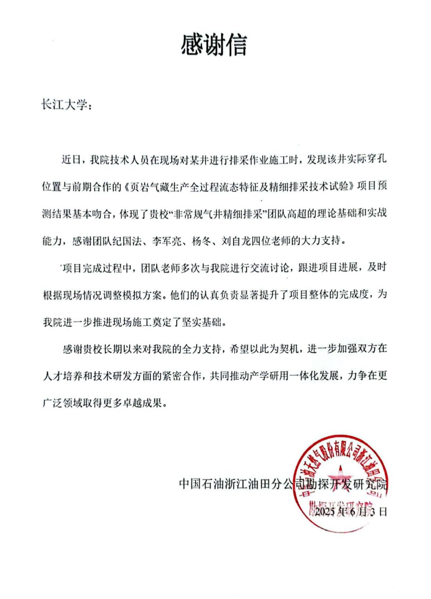 浙江油田勘探开发研究院在感谢信中表示,感谢我校⻓期以来对他们的全力支持,希望以此为契机,进一步加强双方在人才培养和技术研发方面的紧密合作,共同推动产学研用一体化发展,力争在更广泛领域取得更多卓越成果。