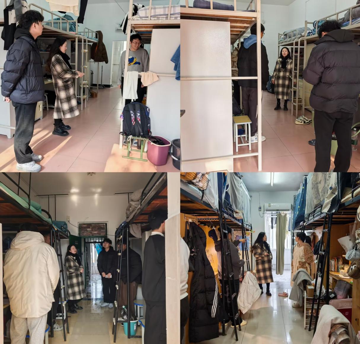 (通讯员 周雨薇 王亭又)寒假临近,为确保学生宿舍的安全与整洁,了解24级学生在期末考试周阶段的学习生活情况,1月2日中午,球王会体育官方网24级辅导员周雨薇老师与兼职辅导员江千喜老师对本院24级学生宿舍进行了安全卫生检查工作。 老师们对宿舍的安全及卫生状况进行了认真检查,对卫生情况较差的宿舍现场提出了改进意见,也对卫生情况良好的宿舍给予了肯定和表扬;同学们要注重宿舍的安全卫生,在宿舍中要保持良好的学习和生活习惯,并围绕宿舍安全对即将来临的寒假假期做出相关注意事项的提醒。最后,就同学们的心理情况和学习状态问题,与各个宿舍的同学们进行了亲切交流,鼓励大家合理安排时间,诚信应考,考出好成绩。 此次寒假前宿舍安全卫生检查,强化了同学们的安全卫生意识,促进了良好、健康的寝室环境的营造。不少同学表示,将会以良好的状态迎接期末考试,以快乐的姿态度过美好假期。 【审核:张昊 编辑:韩清越】