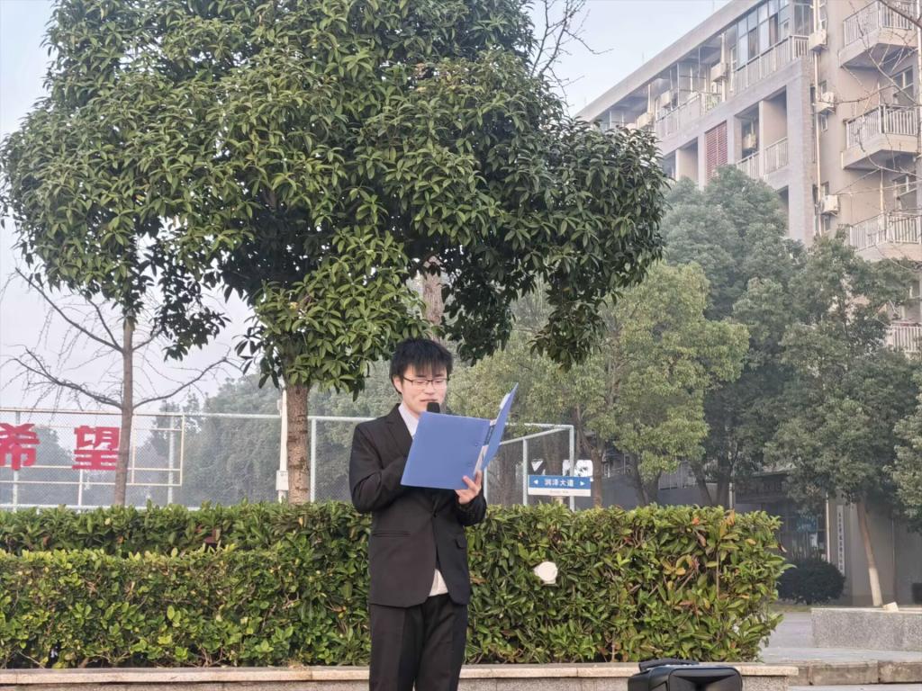 在庄严的国歌声中,鲜艳的五星红旗冉冉升起,全体师生行注目礼,齐唱国歌,深切感受此刻的爱国情感。随后,储运22401班裴俊翔同学作为学生代表发言,他分享了自己从困惑线性代数的专业价值,到参与大创项目后领悟其核心作用的经历,表达了将通过勤学实干积累知识、参与科研创新,践行“能源报国”信念,为国家能源安全贡献青春力量的决心与担当。
