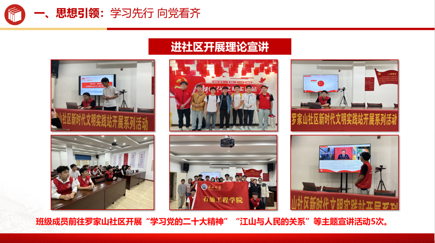 为了营造浓厚的理论学习氛围,我们积极参与学院组织的“时光加油站”与“石油文化素养讲坛”等活动,并深入学习党的二十大精神。通过这些活动,班级成员的思想觉悟得到了显著提升,实现了100%的青年大学习的完成率。此外,累计推优入党积极分子15人,发展预备党员1人、党员1人。充分展现了我们在思想建设方面的成果。