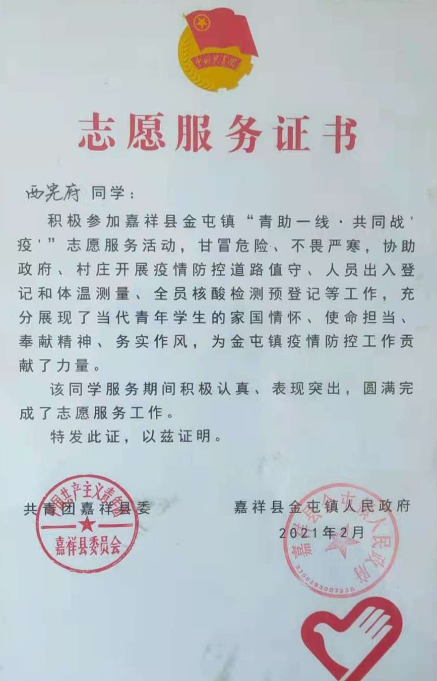 在这场战役中,我校球王会体育官方网海洋油气工程专业2018级1班西宪府同学,主动参加嘉祥县“‘青’助一线,共同战‘疫’”志愿服务活动。从每天的定点站岗执勤,再到公共设施的消毒、帮助发放口罩、酒精等工作,西宪府同学甘冒风险、不畏严寒,用实际行动诠释了勇敢于坚强、责任与担当,实现了走上社会舞台的“精彩亮相”。西宪府同学用行动证明了青年一代有担当、敢于担当的精神面貌。在这场疫情防控战争中,西宪府同学在做好每一件小事、完成每一项任务、履行每一项职责中无私奉献自己的青春力量。为嘉祥县疫情防控工作贡献了力量。