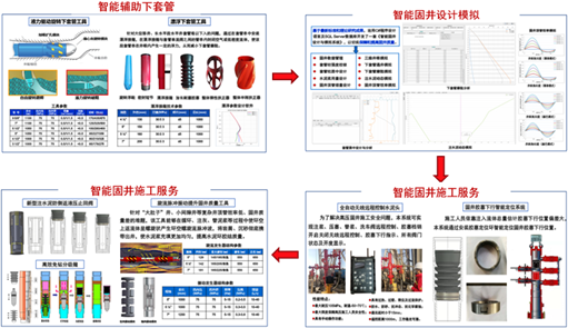 针对特殊井、复杂工艺井固井技术难题,研制了液力驱动旋转下套管工具、漂浮下套管工具,全自动无线远程控制水泥头、固井胶塞下行智能定位系统、新型注水泥防倒返液压止回阀、高效免钻分级箍、旋流脉冲振动提升固井质量工具;开发了智能固井设计与模拟系统、固井施工全过程监测分析预警系统,形成了大数据预测固井质量与施工优化 顶替效率数值模拟评价 固井水泥环完整性评价等系列技术。